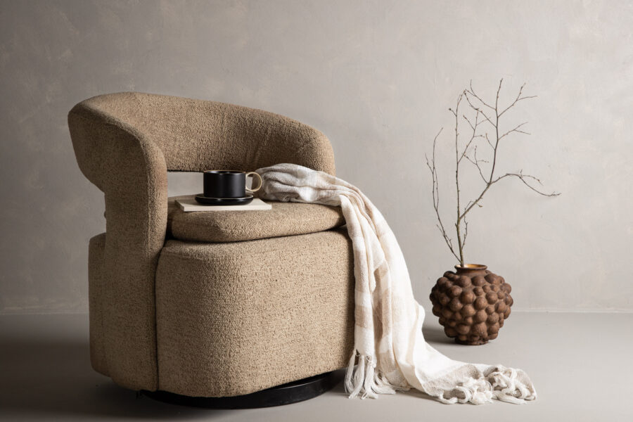 Fauteuil Laurel – Tissu bouclĂ© marron et pieds noirs