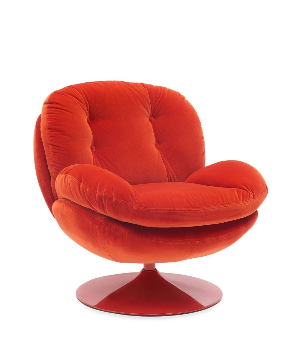 Le velours mat assourdit le rouge franc pour lui donner une profondeur. Pied laqué rouge : le fauteuil est d’un seul bloc, pas un rouge-plus-autre-chose.