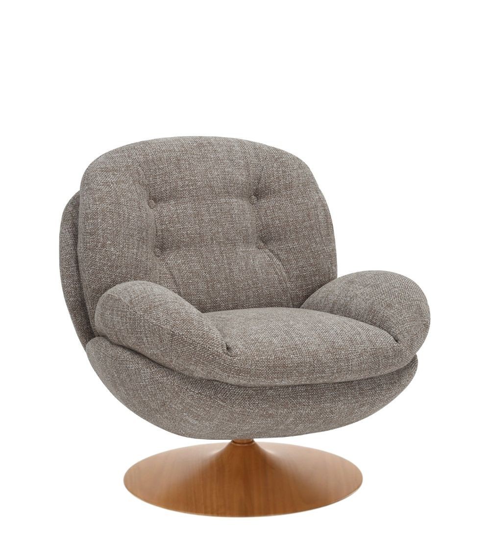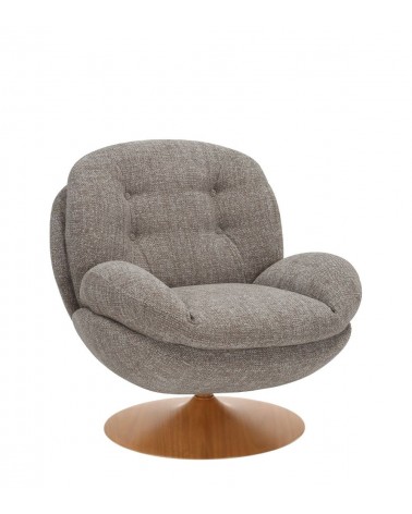 Le pied naturel conserve la cohérence chromatique chaude : bois clair, velours taupe, tout dans la même famille sable-sable chaud. Aucune rupture visuelle. Le fauteuil se lit comme un volume monobloc qui ne pèse pas sur le salon.