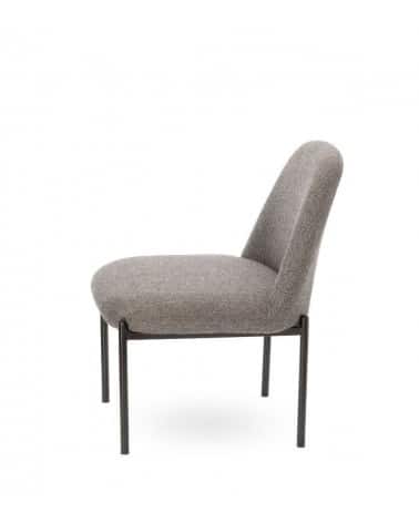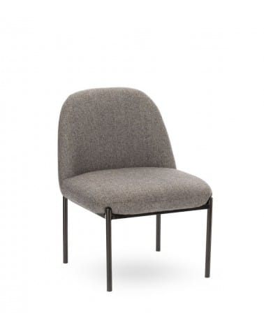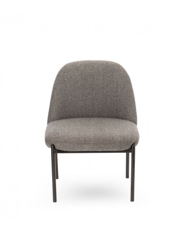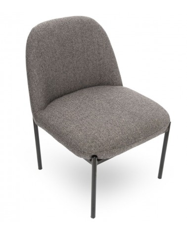 Assise 54 × 50 cm à 42 cm du sol. Mousse assise et dossier 24 kg/m³. Tissu 50% laine + 50% polyester chevron gris. Piétement métal noir. 66 × 56 × H74 cm. 6 kg.