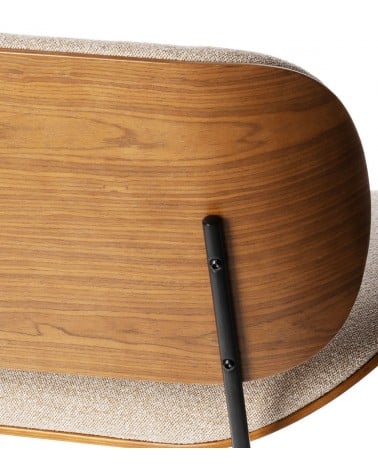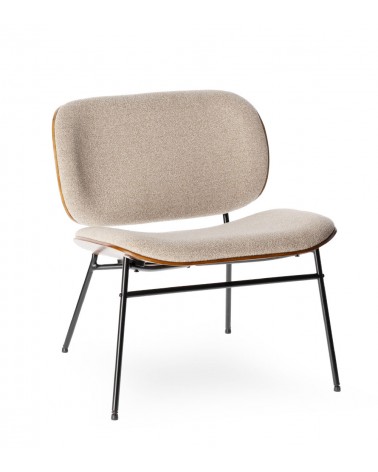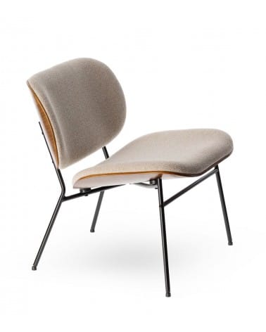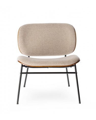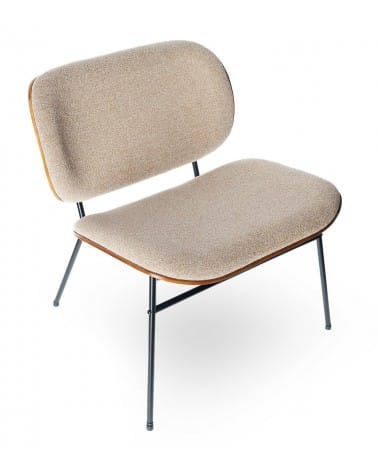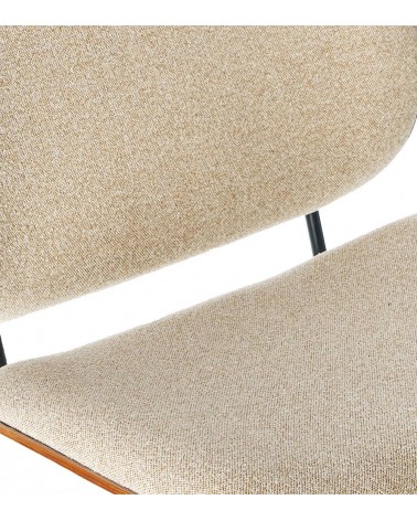 Assise 60 × 47 cm à 42,5 cm du sol. Mousse 21 kg/m³. Tissu 100% polyester beige. Piétement métal noir biseauté. 62 × 65 × H68 cm. 9 kg.