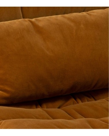 Assise 80 × 53 cm à 48 cm du sol. Mousse assise 35 kg/m³, dossier 35 kg/m³. Revêtement velours 100% coton. Piètement métal. 84 × 84 × H94 cm. 18 kg.