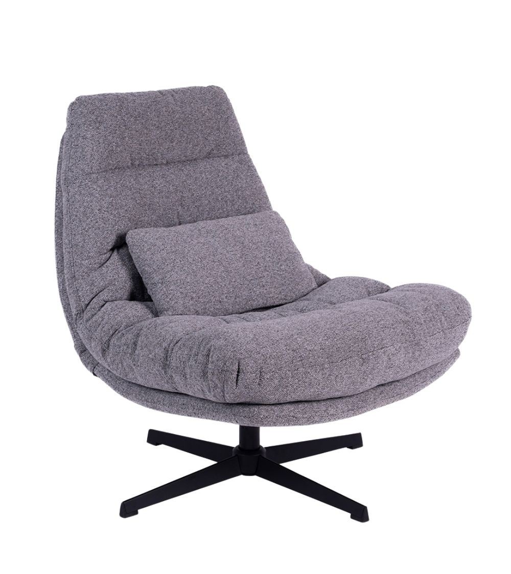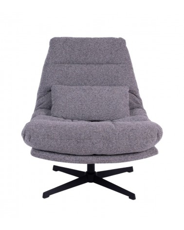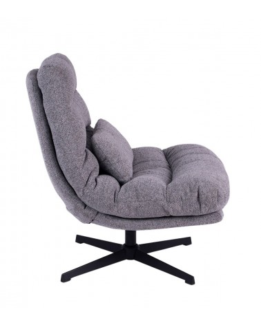 Assise 80 × 53 cm à 48 cm du sol. Mousse 35 kg/m³ assise et dossier. Revêtement velours 100% coton gris. Piètement métal. 84 × 84 × H94 cm. 18 kg.