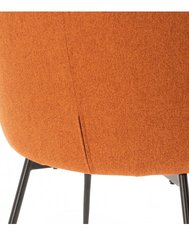 Assise 52 × 52 cm à 41 cm du sol. Mousse assise 25 kg/m³, dossier 22 kg/m³. Velours 100% polyester orange brûlé. Piétement métal. 70 × 65 × H72 cm. 8 kg.